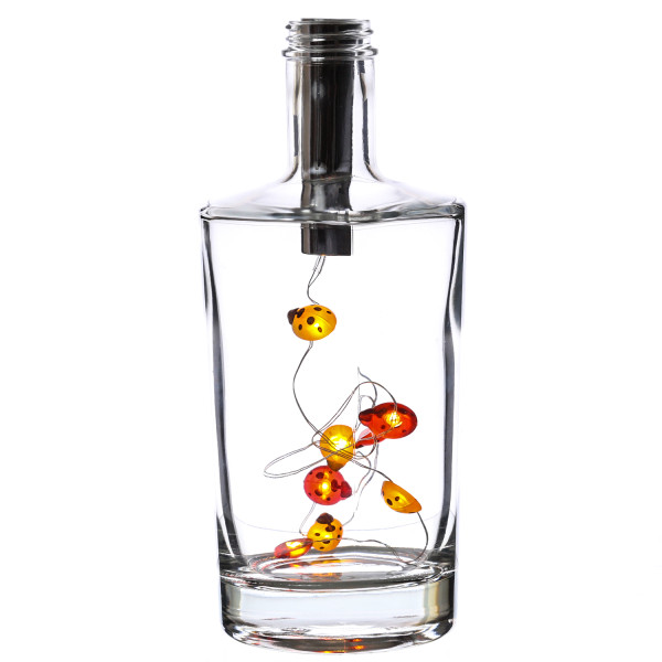 Die LED Lichterkette Korken mit den Mini Marienkäfern als Motiv ist die perfekte Ergänzung, wenn Du eine alte Flasche dekorieren bzw. beleuchten möchtest. Das Batteriefach ist so gebaut, dass es für eine einfache Glasflasche passt. Du kannst also die Lichterkette schön in einer Flasche dekorieren und das Batteriefach in den Flaschenhals stecken.