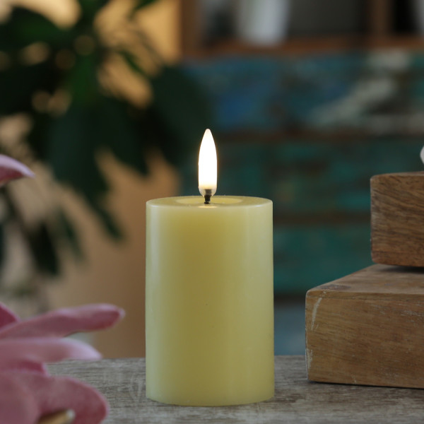LED Mini Kerze THEA - Echtwachs - 3D Flamme mit Wachsspiegel - D: 5cm - H: 7,5cm - Timer - gelb